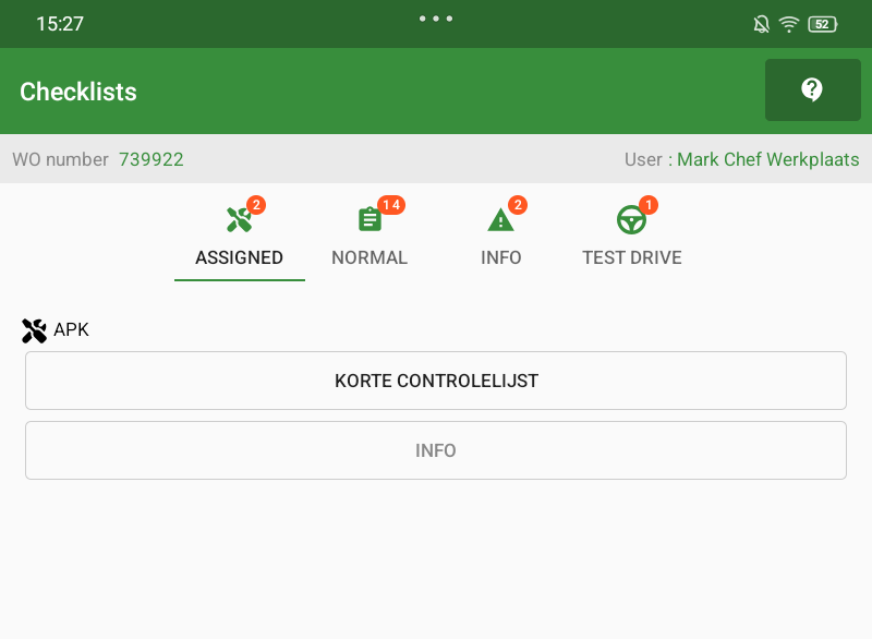 On tablet the mechanic can find the mandatory checklists under the tab Assigned. Upon opening this checklist, the mechanic does not need to add a purpose.