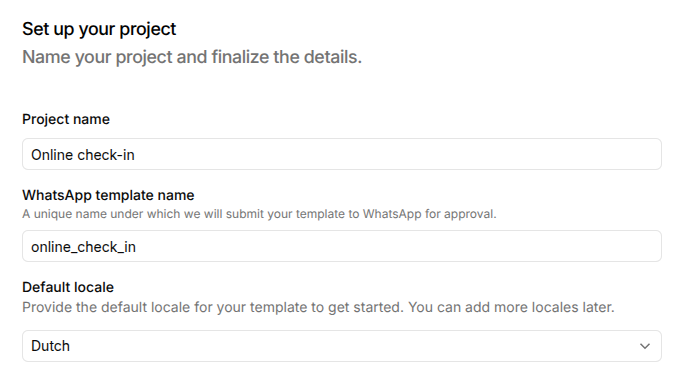 Give a name to the project according to the customer communication that will use the template, and the language used in the template, here we start with Online Check-in: