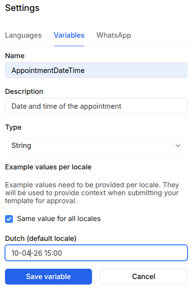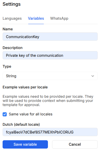 Enter `DealerName` as Name, `Commercial name of the dealer` as Description, `String` as type, an example value, and click on Save variable: