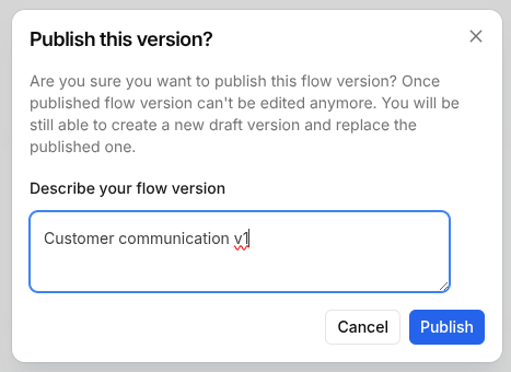 When clicking on Publish, a modal will ask you to describe your flow version, we recommend to enter `Customer communication v1`, and every time you publish an update, to increment the version number: