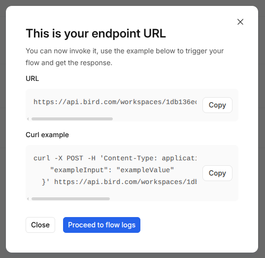 Another modal will open with the detail on how to call this flow will be displayed: