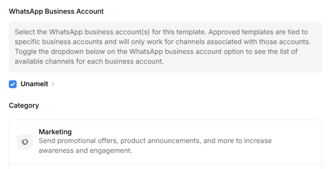 Choose the business account set up for WhatsApp before starting this process, and the Marketing category (important):