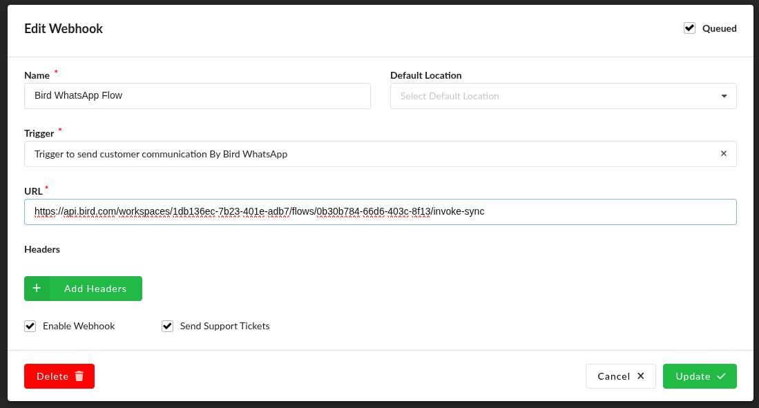 Enter a `Name`, select `Trigger to send customer communication by Bird WhatsApp` as `Trigger`, and paste the flow URL in `URL` ( refer to the section Setting up Bird > Automated Flow above for the flow URL ).