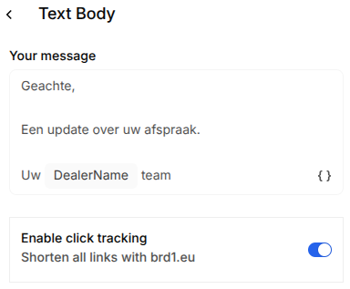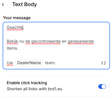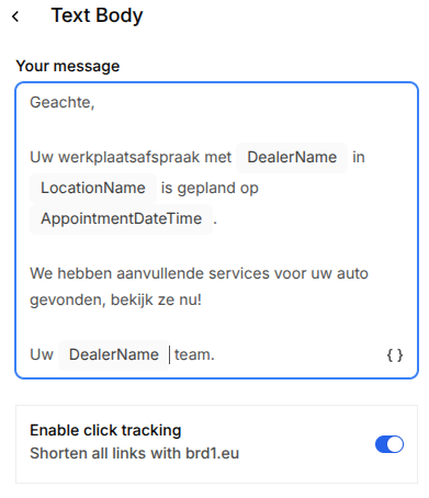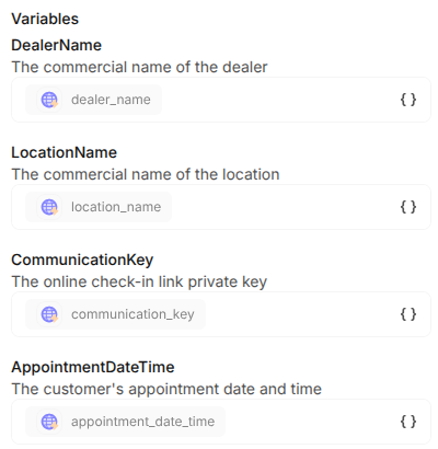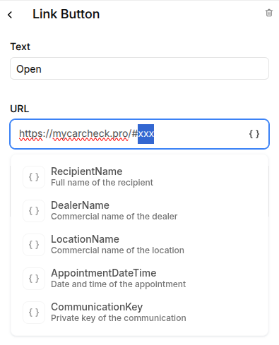 Select the first `xxx`, click on the { } icon in the bottom right of the editor, and select the corresponding variable created earlier, in this example the dealer name: