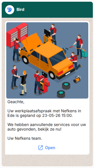 Automated communication will be sent by WhatsApp if a mobile phone is present and the customer did not choose another preferred way of communication.