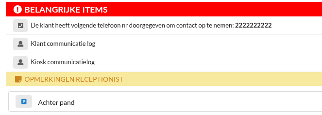 Nadat de Kiosk check-in is voltooid verschijnt de notitie bij belangrijke items in de werkorder: