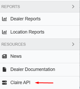Claire's API allows users to retrieve information for use in customer-specific systems. This requires an API key, which can be generated by a user with the Dealer Admin role. This unique API key provides access to dealer information (and associated locations). Here are the steps to create an API key:
