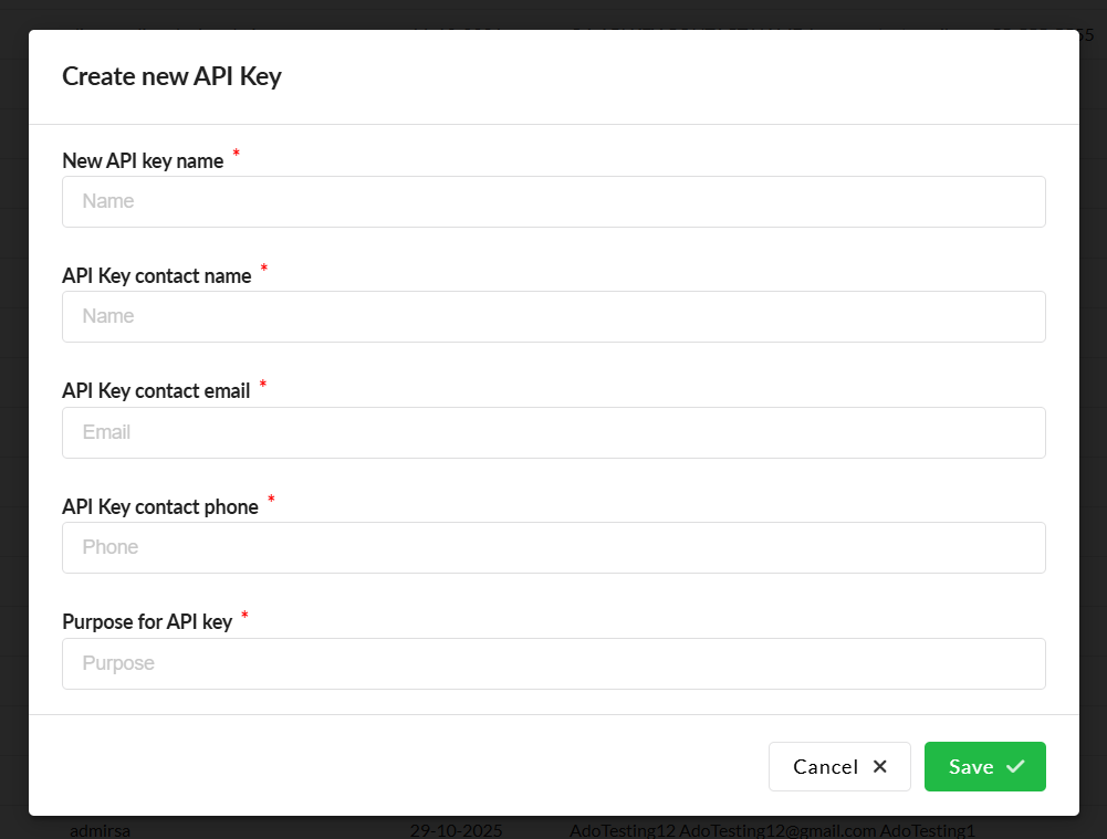 After clicking the "Create API Key" button in the top left corner of the page, a menu is presented asking for various information: