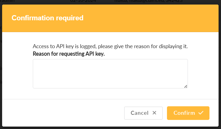 When you click "Show API Key," a pop-up appears asking you to enter the reason for requesting the API key. This information will be saved in the log.