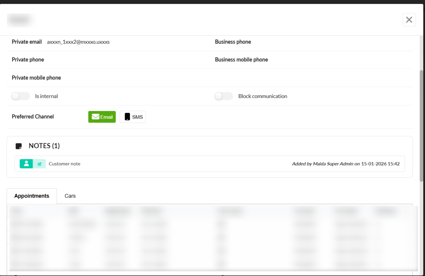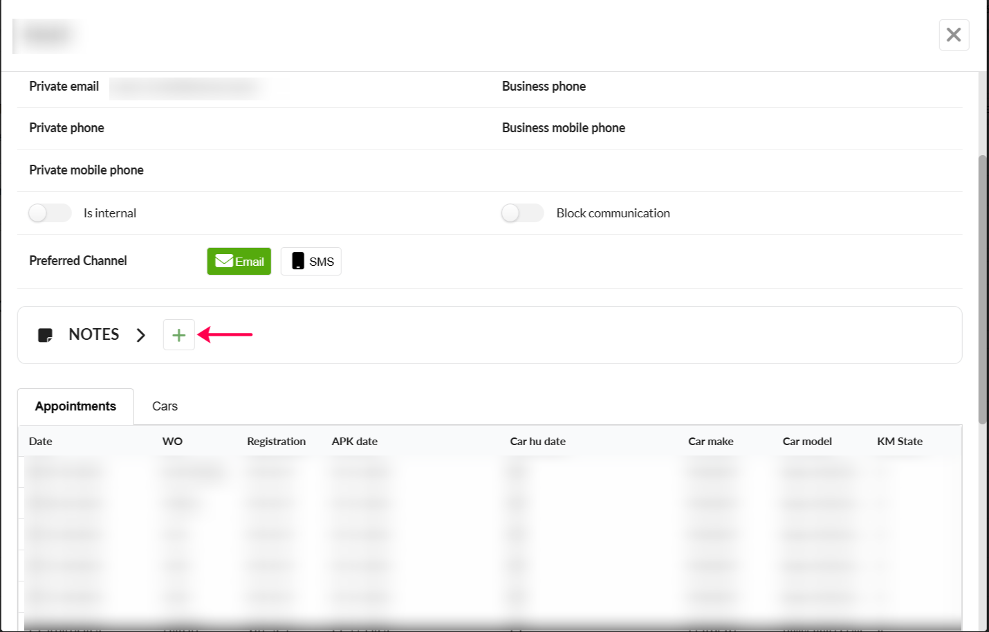 The Customer modal will open. Above the Appointments / Cars table, click the plus button to add a note.