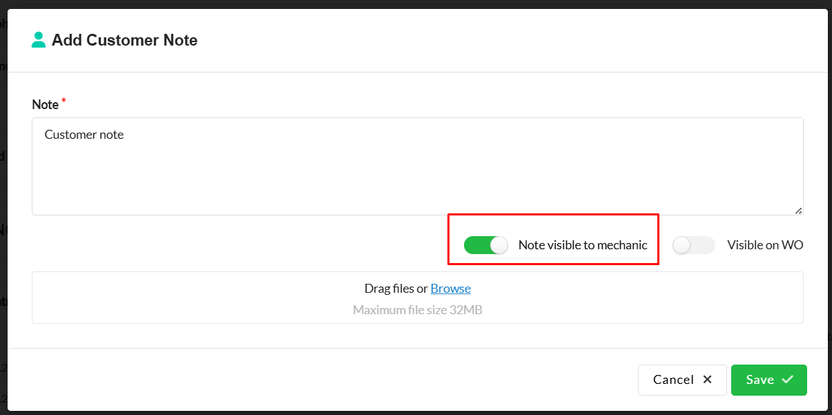 - Visible to mechanic: When enabled, the note is visible to mechanics on the tablet.