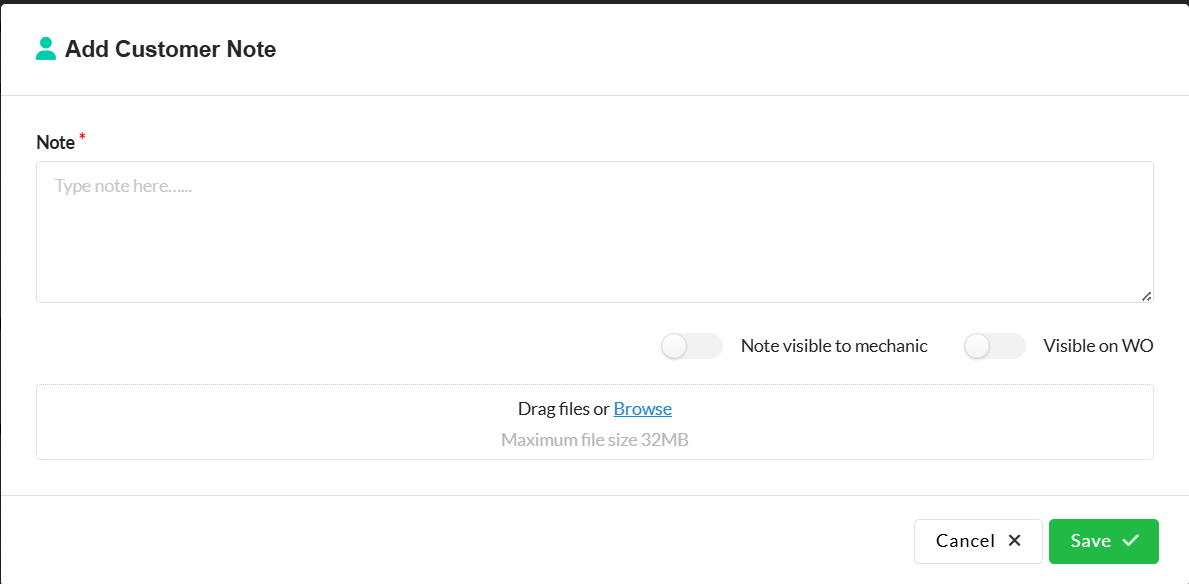 Visible on WO: When enabled, the note will automatically appear in the Notes section of current and future workorder linked to that customer. This removes the need to manually add the same note to each individual WO.