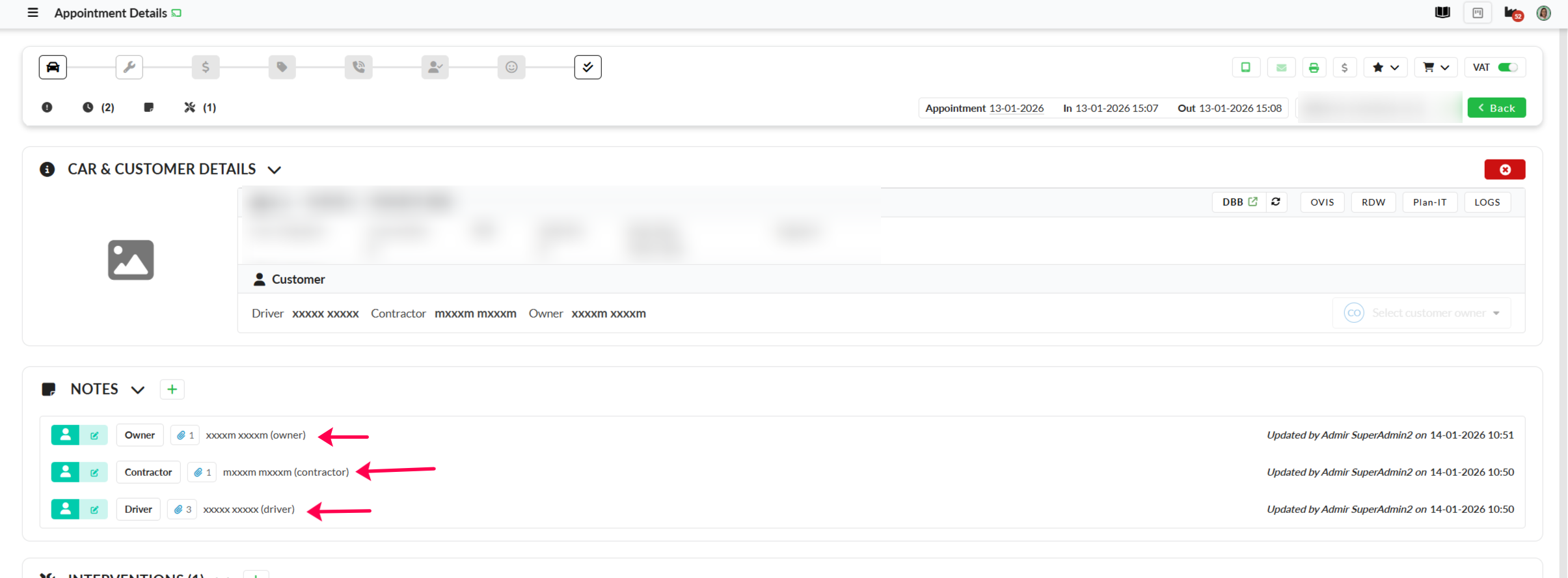 The customer note can be added from the Appointment Details page, the Car Details page, and the Customer page.