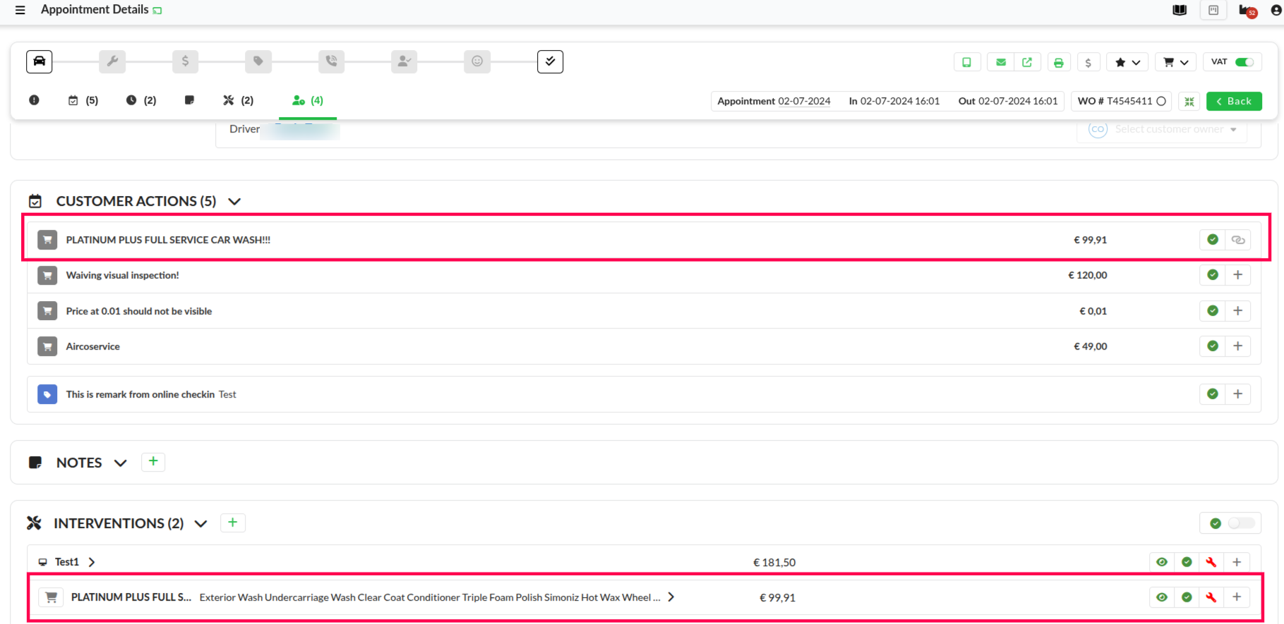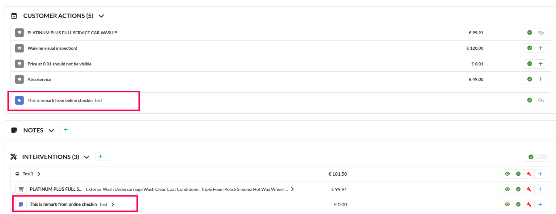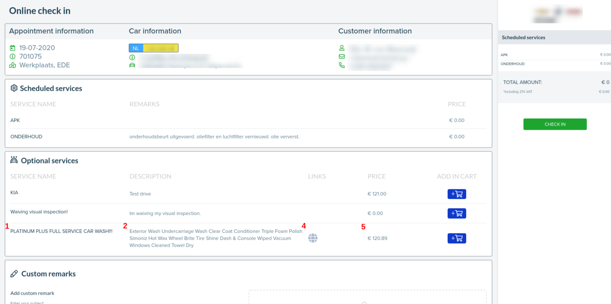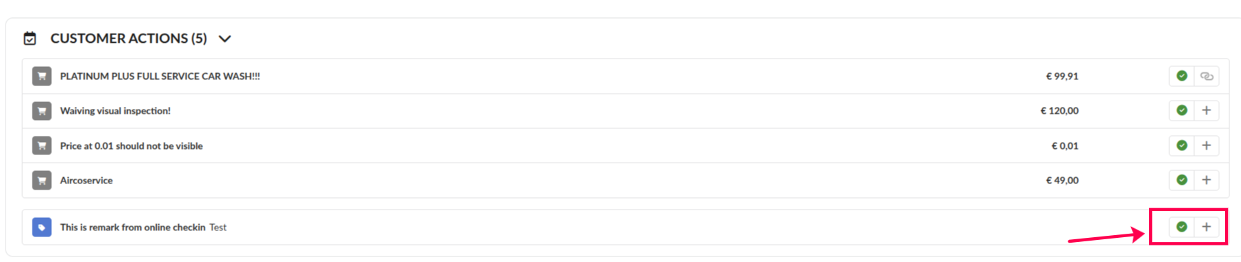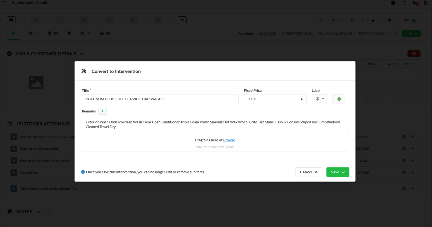 With this functionality a receptionist can convert an online check-in service and/or remark to interventions. This makes it clear to the mechanic that this extra service needs to be completed.