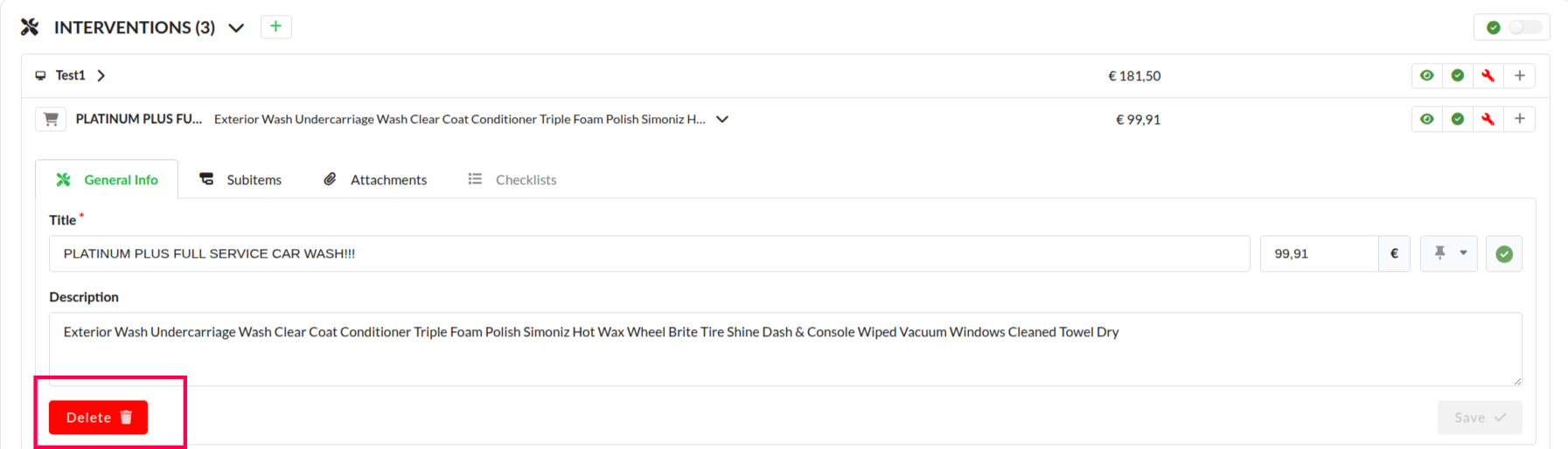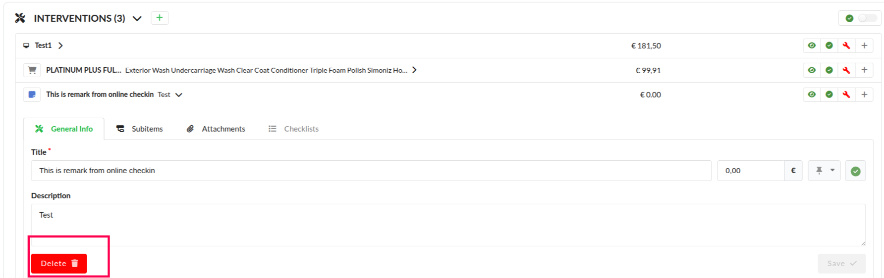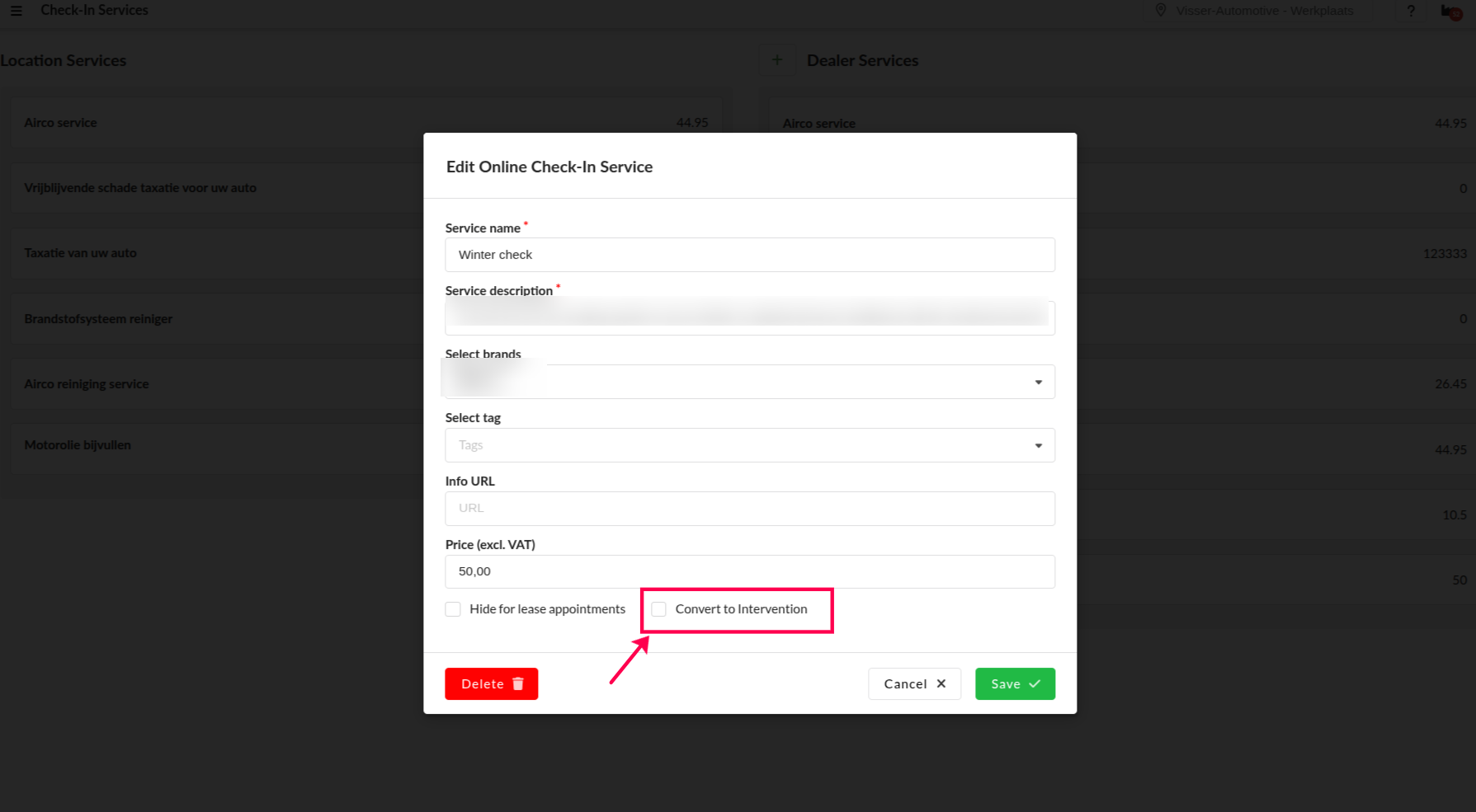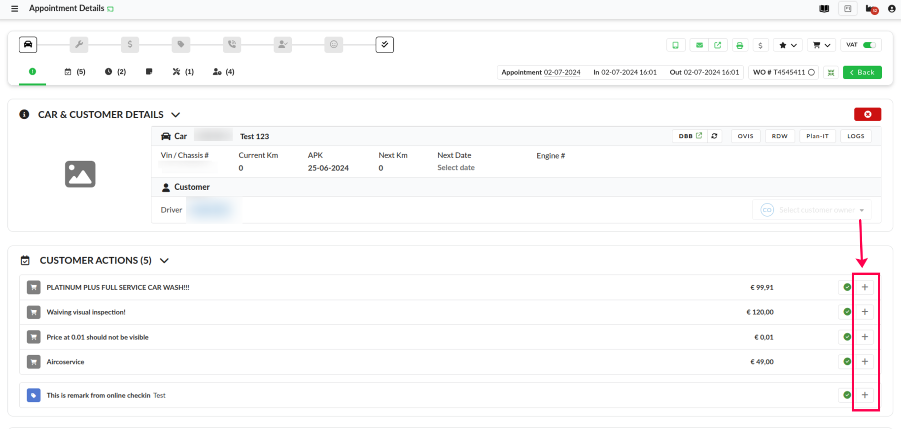 With this functionality a receptionist can convert an online check-in service and/or remark to interventions. This makes it clear to the mechanic that this extra service needs to be completed.