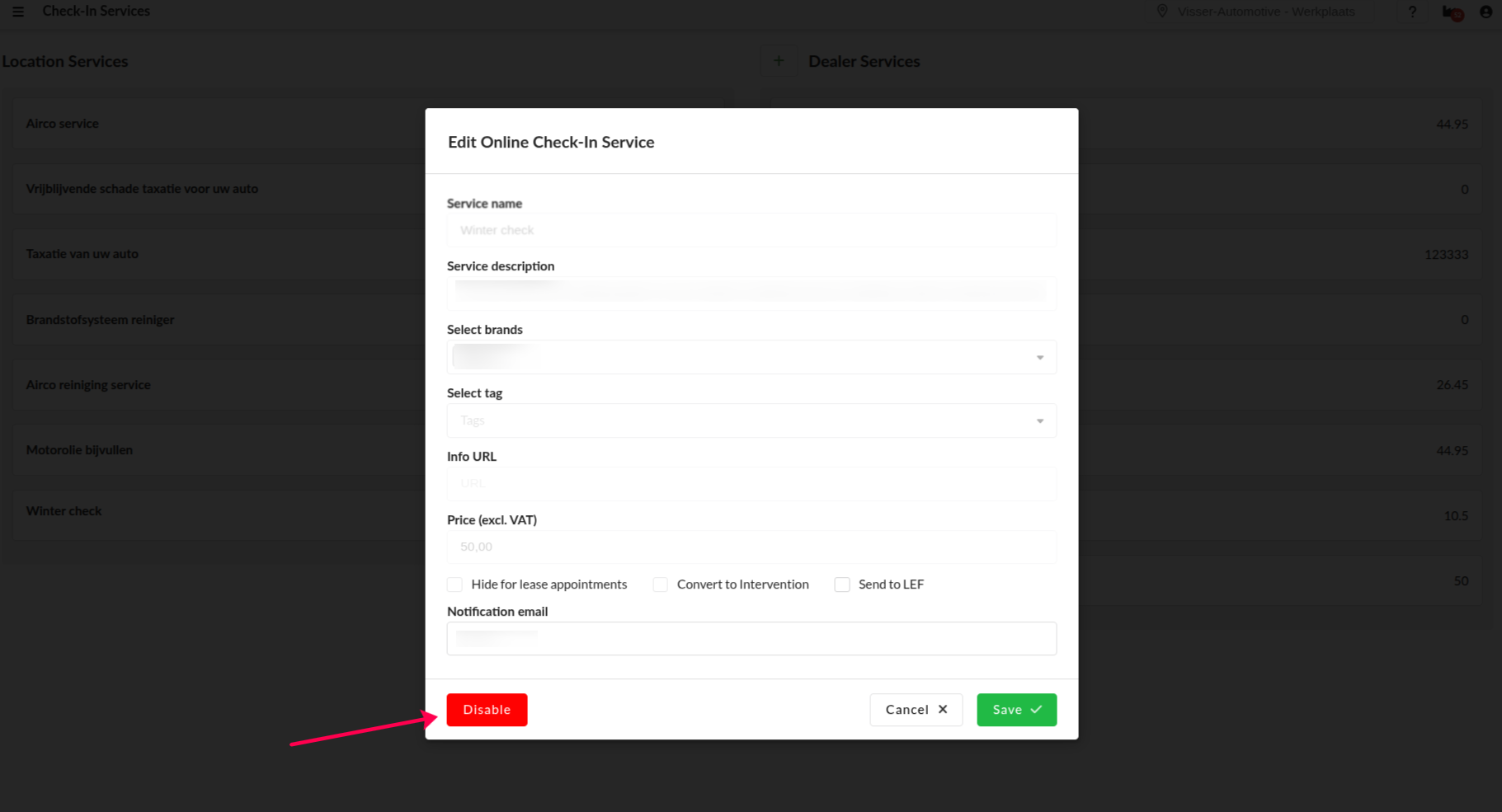 On the Edit check-in service page, click the Disable red button on the bottom left corner.
