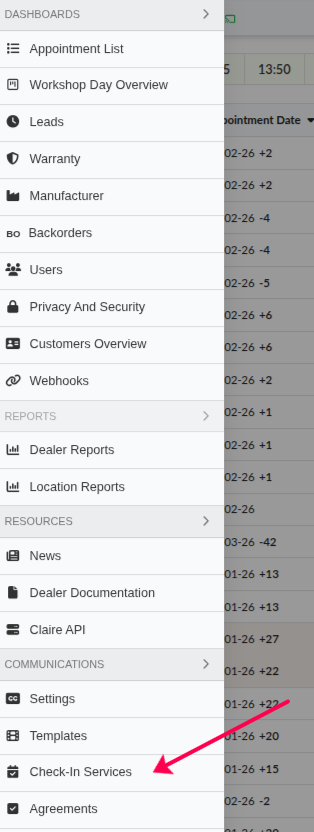First, go in the hamburger menu, under the Customer Comm section click Check-in Services.