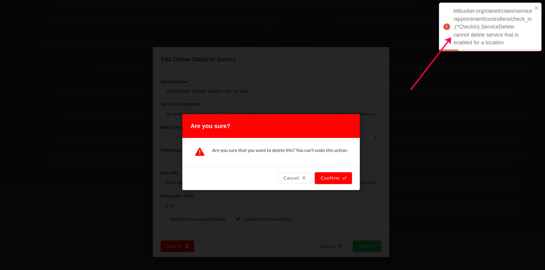 Prior to delete a service, you must disable it on all locations. If you don't, you will get the error message display below: