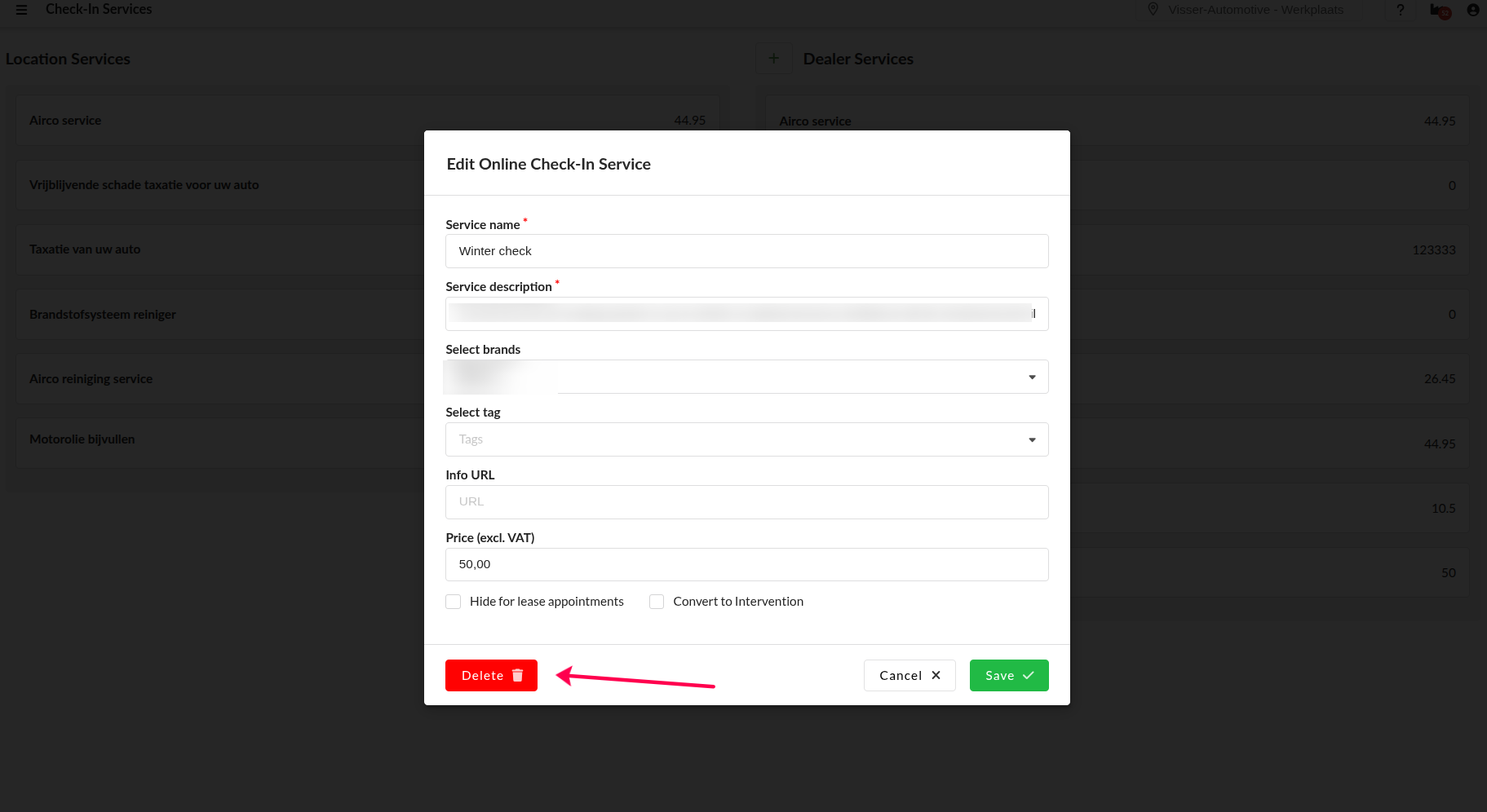 Click on the service to be deleted on the right column (Dealer services).