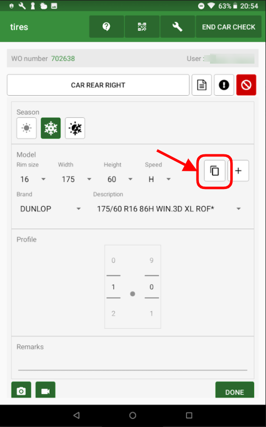 Note that by completing any LEFT tires, the RIGHT tires will be automatically be pre-filled with the same value. Moreover after selecting FRONT tires value you will be able to copy its value to the REAR tires using the button indicated below: