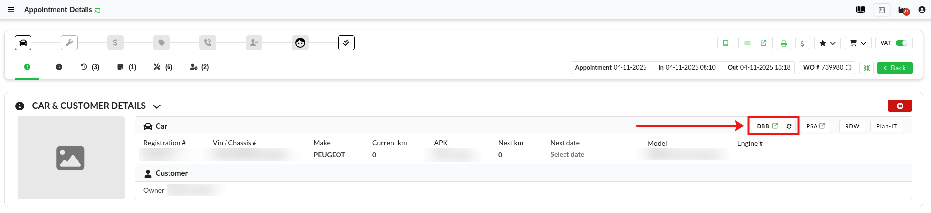 By clicking on the DBB Button, the mini portal will open. From that system you can manage the contract of this car, the known tires, appointments to retrieve tire set, print labels to return them, etc.