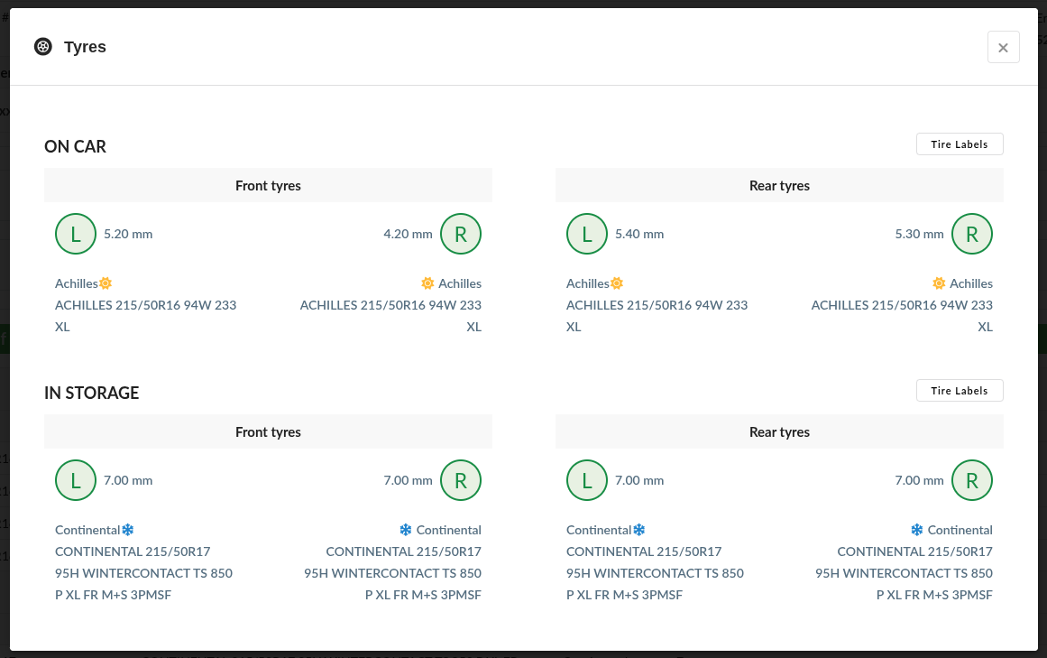 When a workorder is being created in Claire (through your DMS or directly in Claire), this feature will automatically synchronise the information about the tires, making the tire element question accurate and easily update information on which set of tires is now mounted on the car and which one would be stored.