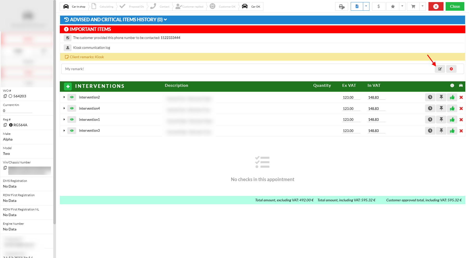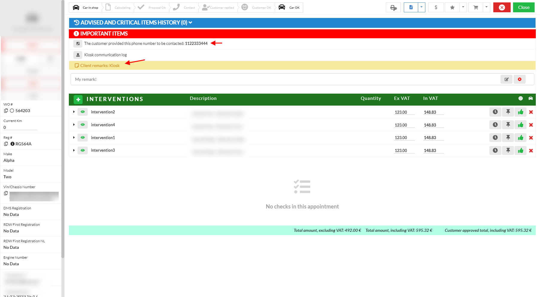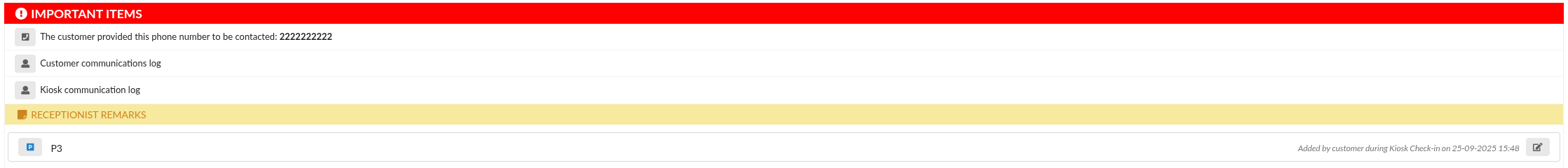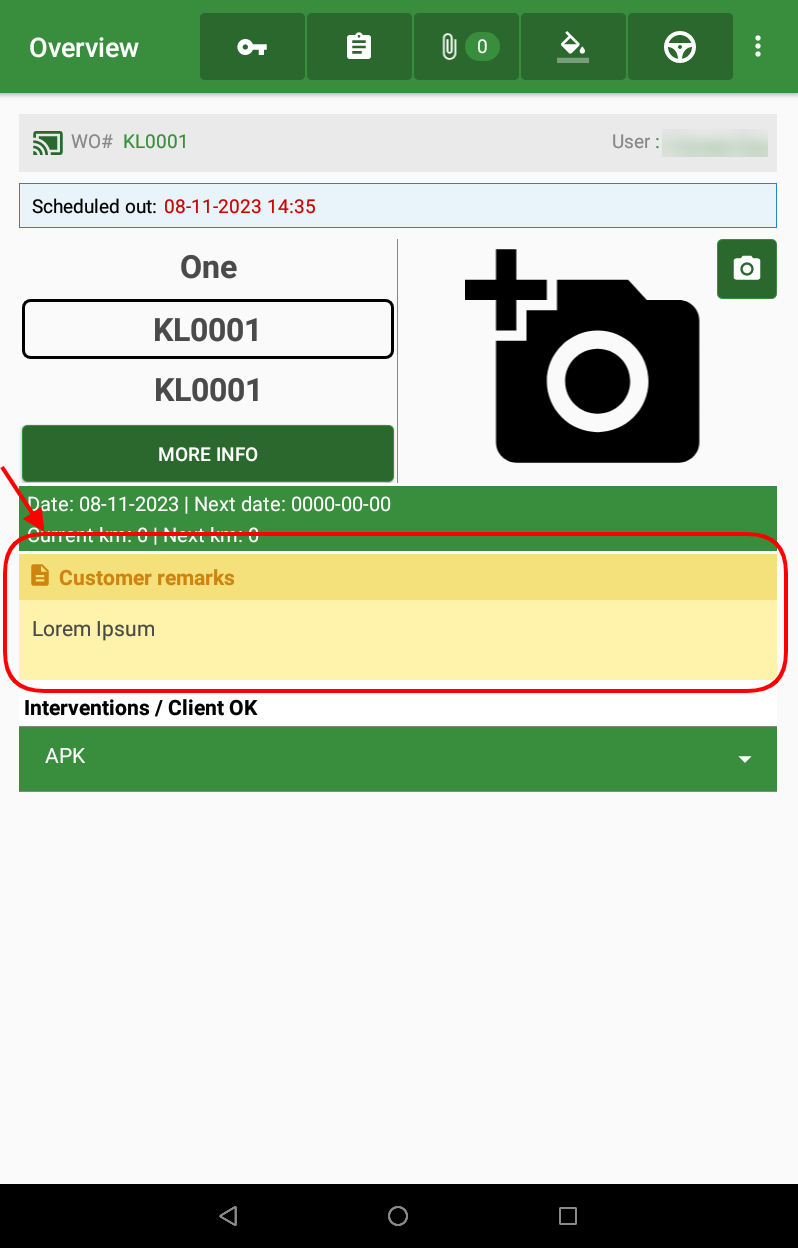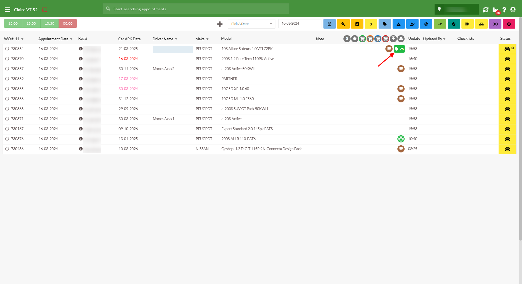Once the customer has dropped his keys an icon will appear next to the WO on the main page, the workorder will then be moved on the top of the list. The color of the field for driver/owner/contractor should now be blue whether because of an Online check-in was answered previously or because the Kiosk is now answered.