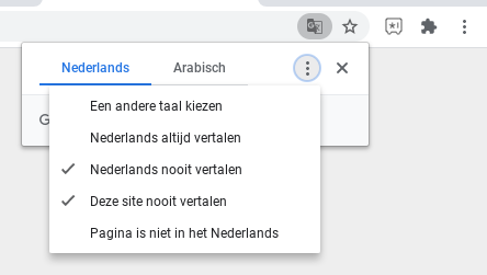 Ga rechtsboven naar de menubalk en klik op het taal icoon, selecteer vervolgens: Deze pagina nooit vertalen.
