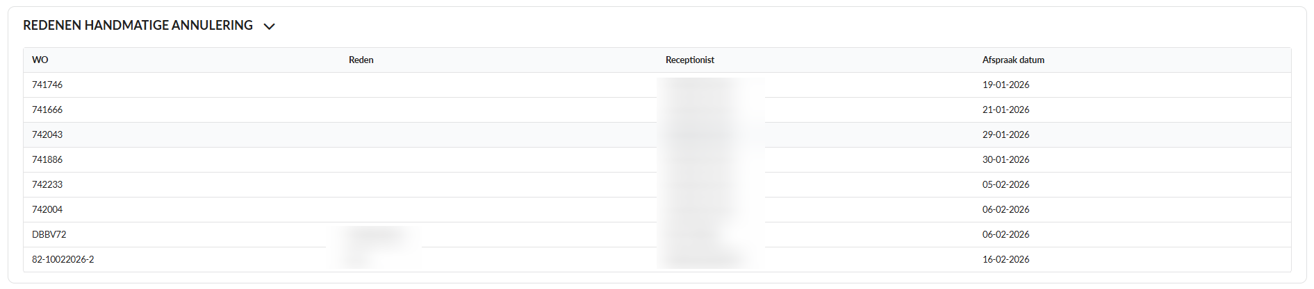 - Receptionist: Naam van de receptionist die de reden Anders voor annulering heeft gekozen