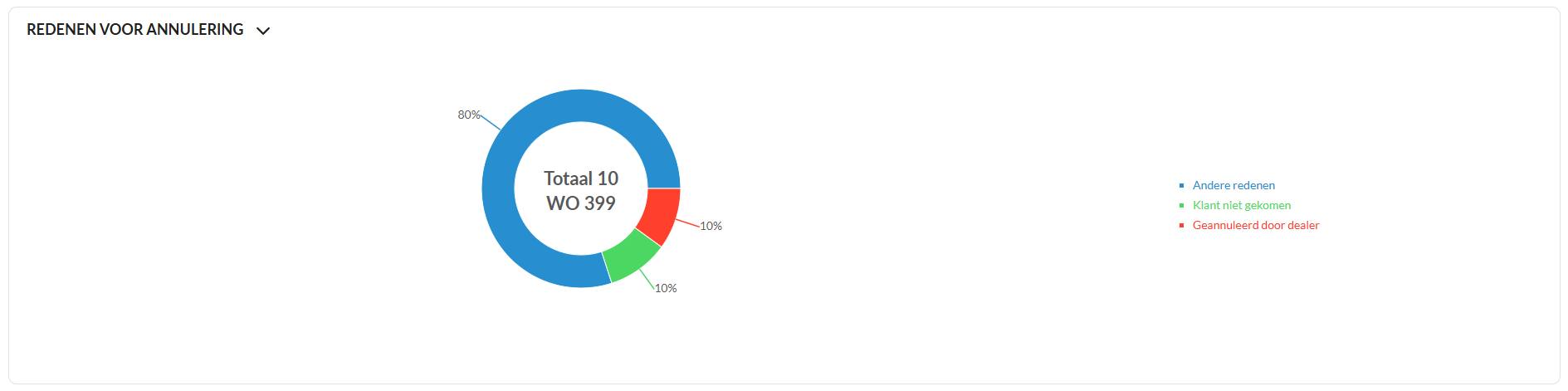 Deze grafiek toont de redenen die de receptionist aangeeft voor het annuleren van een werkorder in Claire.