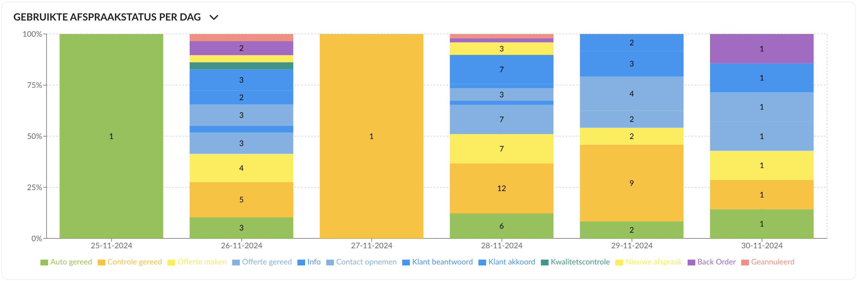 - Verticale as: Gestapelde percentages van het gebruik van de werkorderstatussen.
