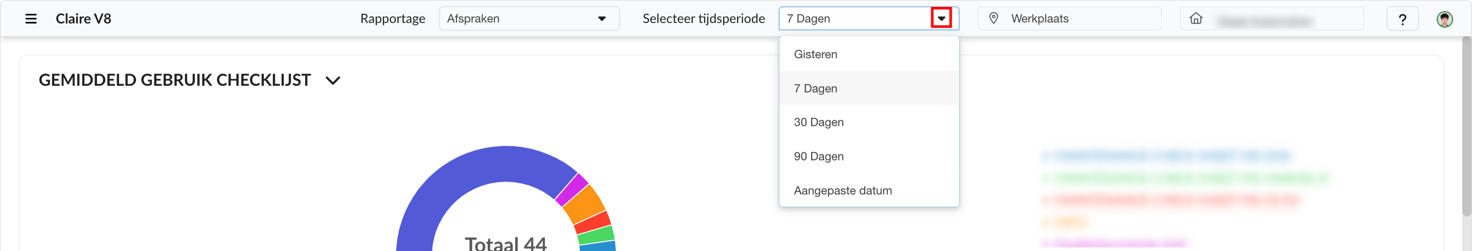 Standaard toont de grafiek de gegevens van de afgelopen 7 dagen. Je kunt de periode aanpassen naar gisteren, de afgelopen 30 of 90 dagen, of een zelfgekozen datumbereik via het dropdownmenu.