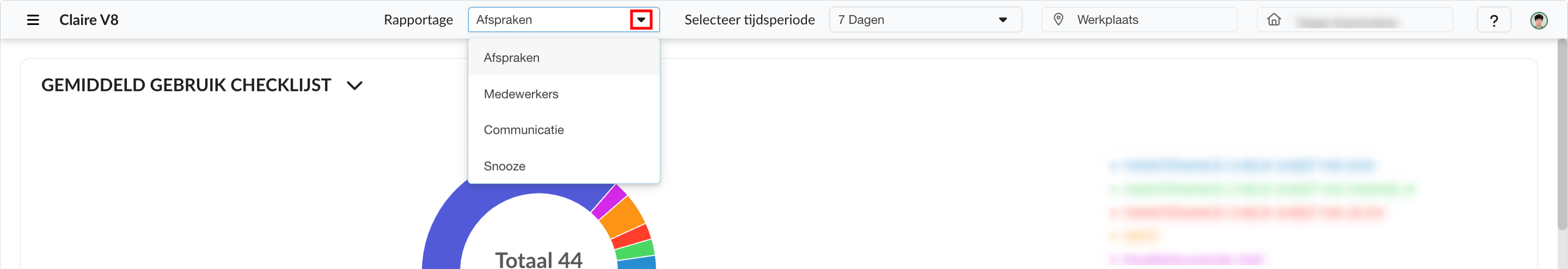 Standaard toont de Afspraken-rapportage. Je kunt het wijzigen naar Medewerkers, Communicatie en Snooze.
