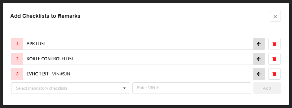 It is possible to add a VIN number to the checklist, then the checklist will only be added to workorders with the corresponding brand.