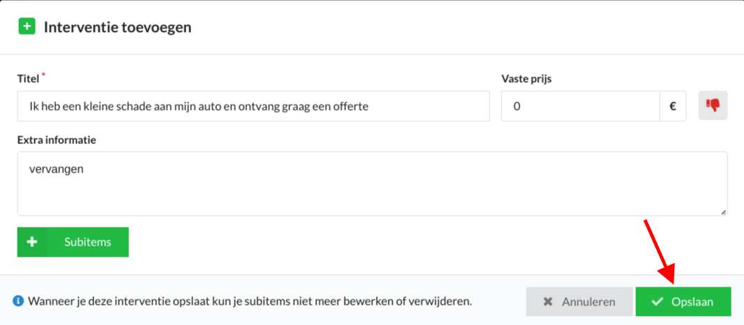 Door op het rode X-knopje te klikken, opent er een venster waarin je een interventie kunt toevoegen.