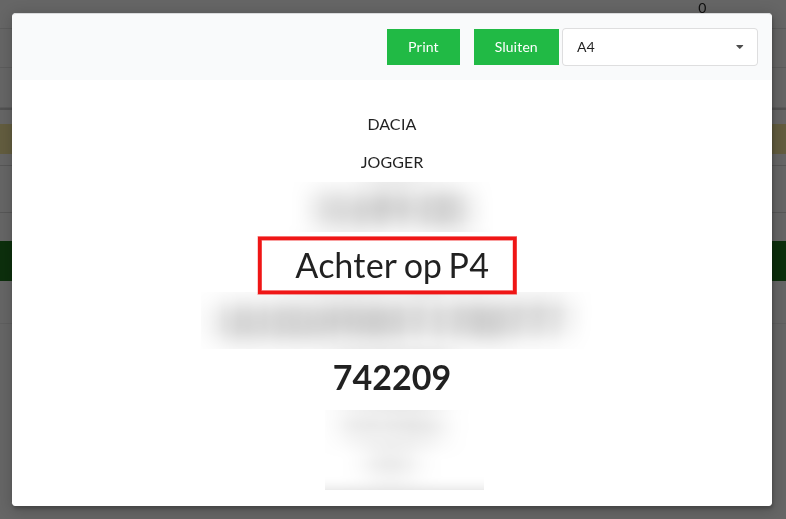 Als er een parkeerlocatie notitie is toegevoegd aan de werkorder, dan is dit ook te zien op het sleutellabel.