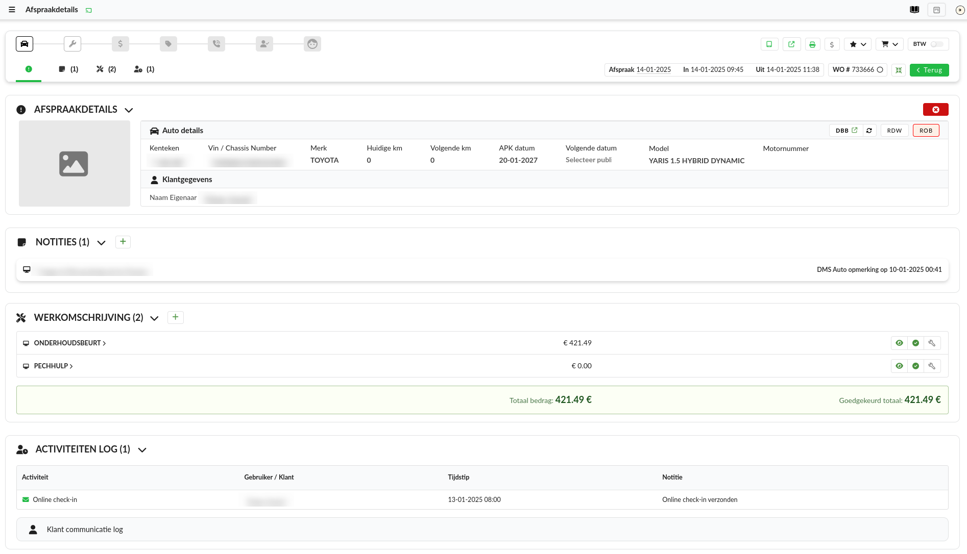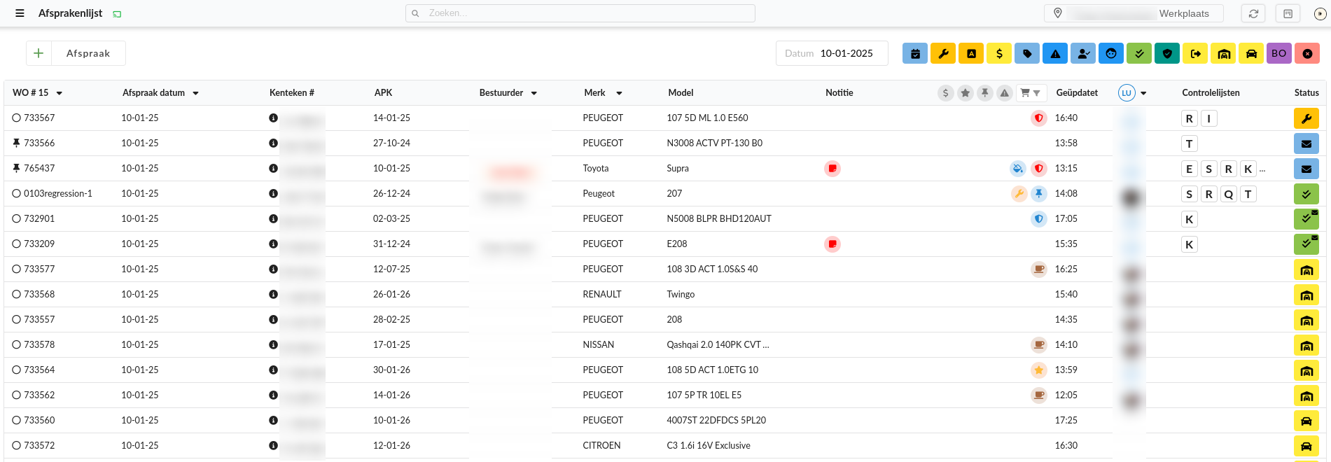 In de afsprakenlijst klik je op een WO om naar de werkorder detailpagina te gaan. Daarin staat aanvullende informatie uit het DMS of de bevindingen van de monteur en controlelijst(en) die hij heeft ingevuld. Klik hier voor meer info.