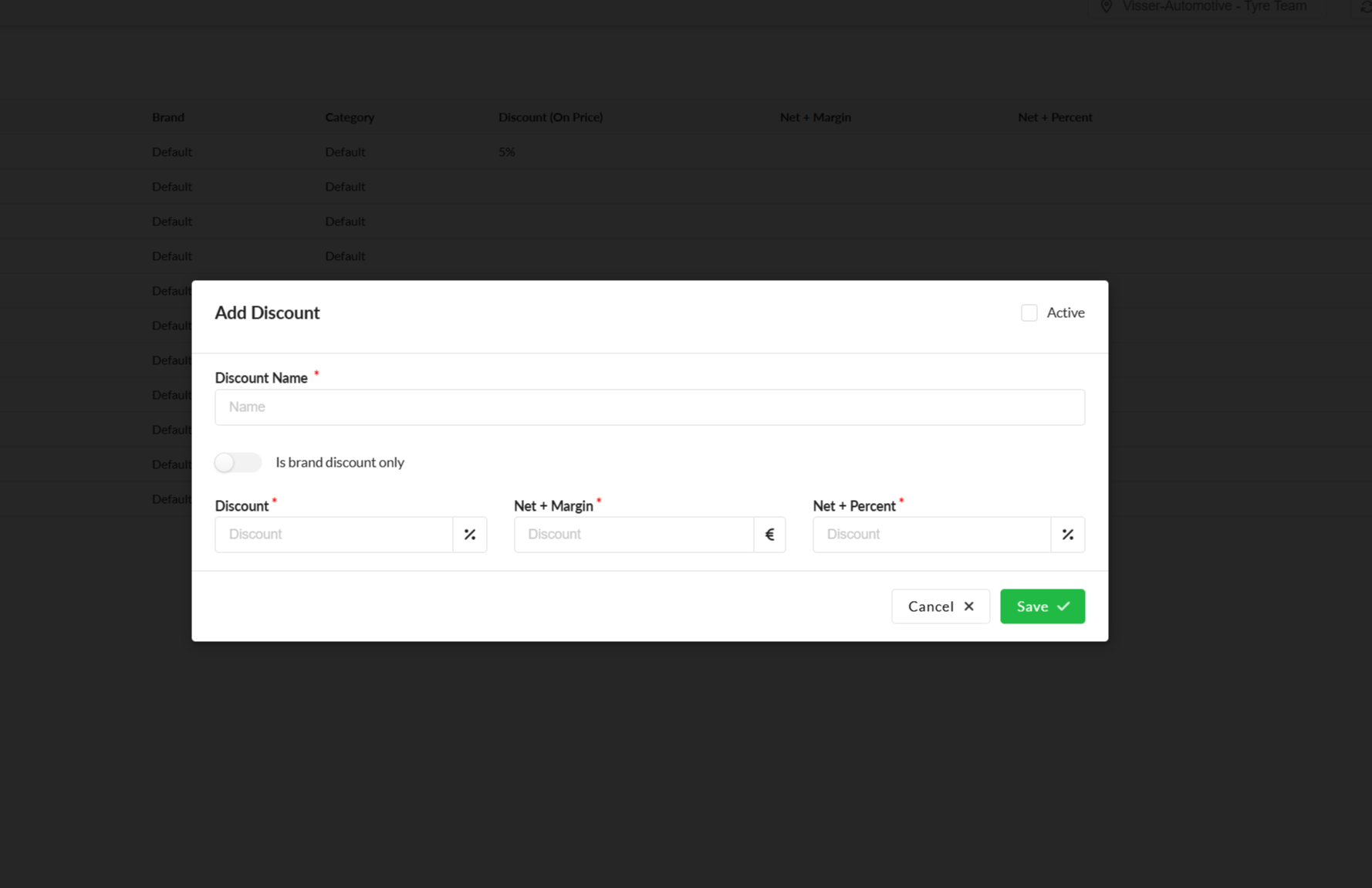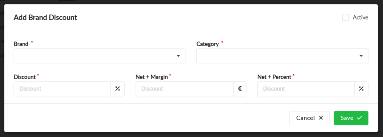 - Discount: Enter a percentage that will be deducted from the gross amount to calculate the customer price if no sub-discount exists for the selected brand.