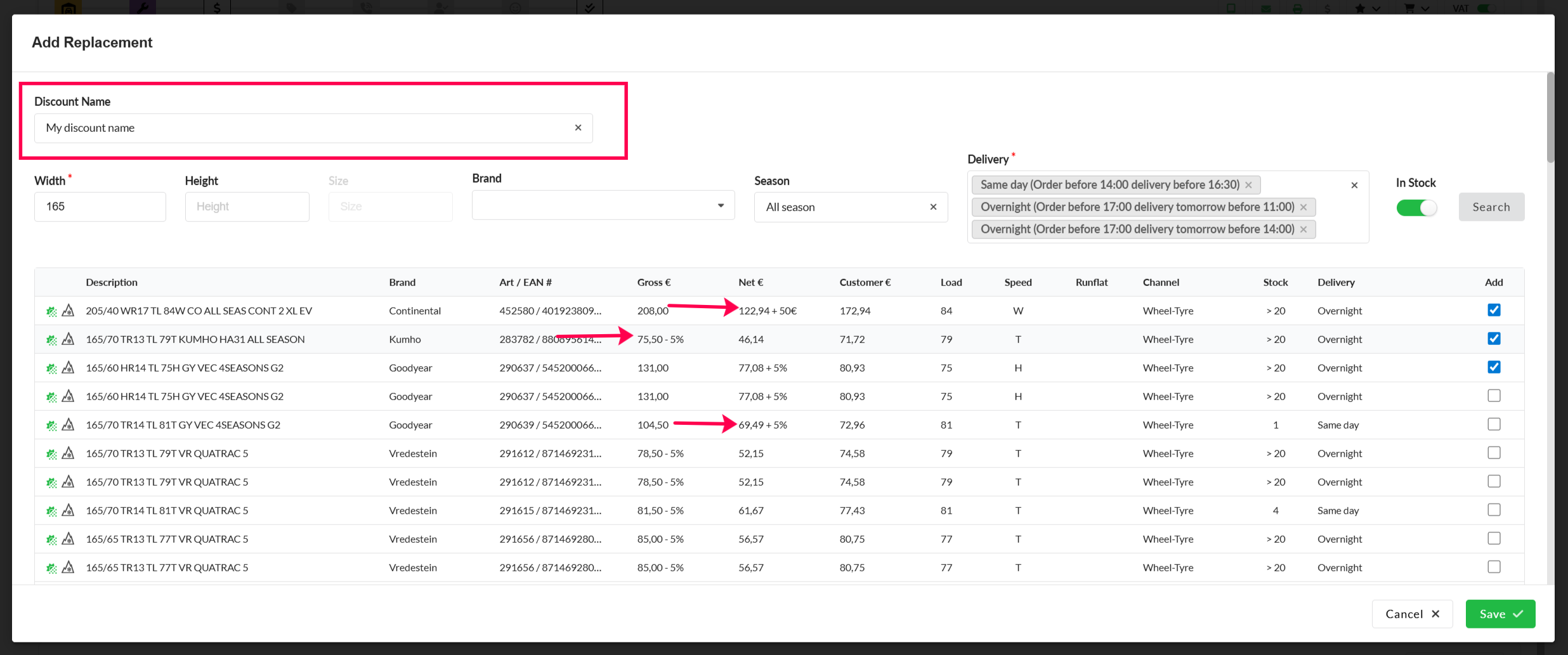 Once your discount is created, on Add Replacement modal you can select from the dropdown in the Discount Name field. When selected discount and brand discount will be applied accordingly.