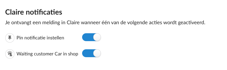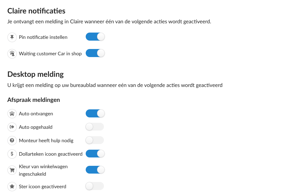 Stel hier in dat je bepaalde desktop notificaties wilt ontvangen bij updates van de afspraken in Claire. Als het om een update vanuit de DMS gaat, kan het 5 minuten duren voordat er een notificatie verschijnt. Om een notificatie te krijgen, moet er wel een tabblad met het programma Claire openstaan.