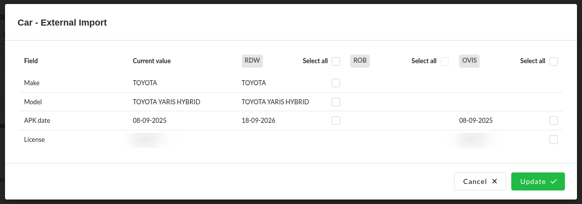 If the car information is missing (brand, modal, APK date) you can import it from RDW, OVIS or ROB* by clicking on External data button.
