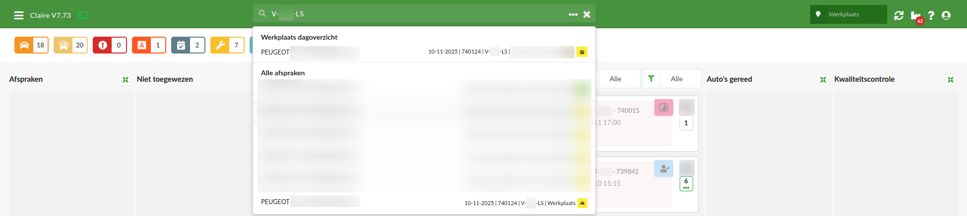 De zoek functie in het Werkplaats Dagoverzicht werkt op de volgende manier: In de zoekbalk kun je zoeken op werkordernummer, kenteken en klantnaam. Klik daarna op de drie puntjes om alle resultaten te zien. De resultaten zijn verdeeld in twee secties: Werkplaats Dagoverzicht en Alle afspraken.