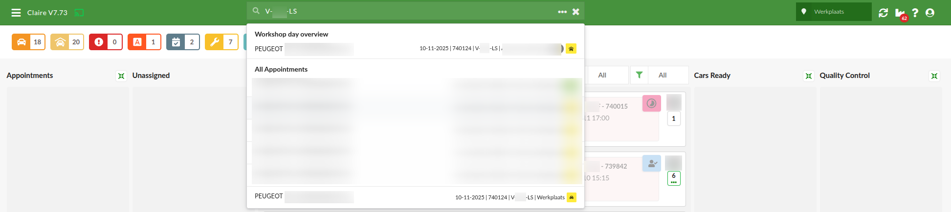 The search function works as following: It is possible to search on workorder number, license plate and customer name. Click on the three dots to show all the results. The results are divided in two sections: Workshop Day Overview and All Appointments.
