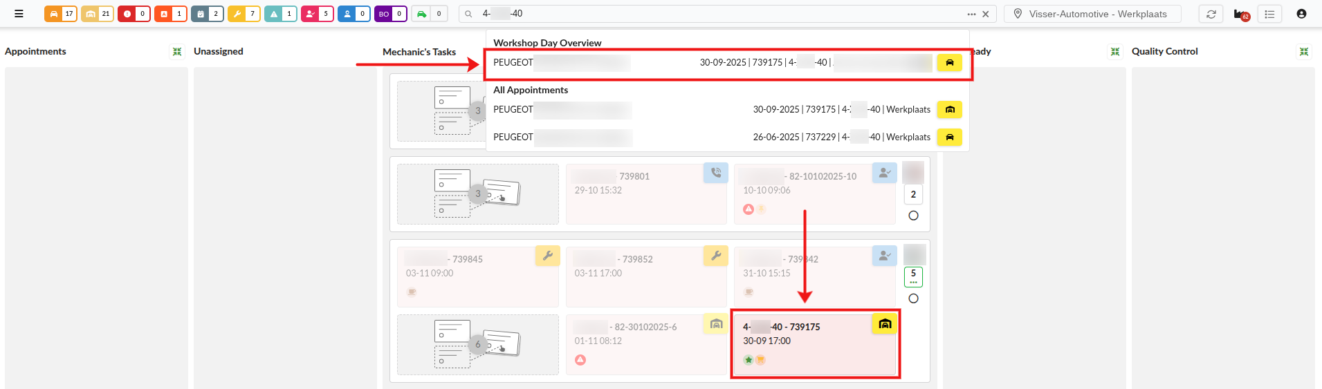 The search function works as following: It is possible to search on workorder number, license plate and customer name. Click on the three dots to show all the results. The results are divided in two sections: Workshop Day Overview and All Appointments.