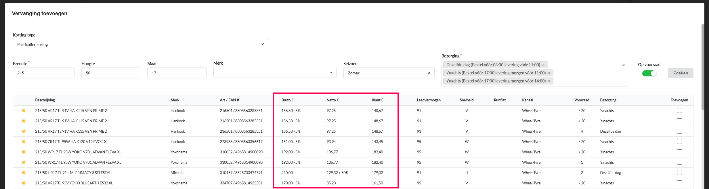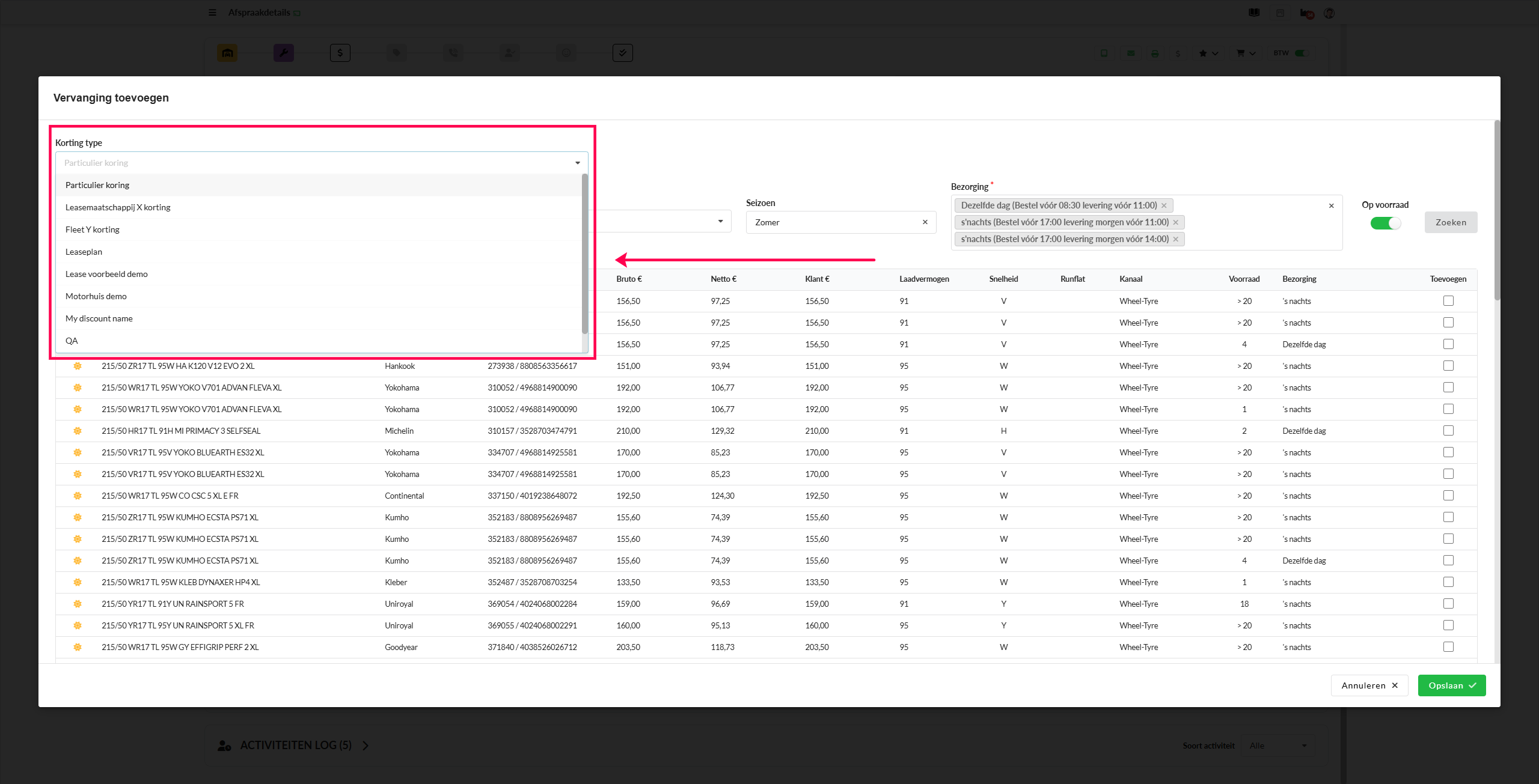 Met deze functie kun je korting of extra marge instellen voor vervangende banden. Deze wordt vervolgens toegepast op de klantprijzen in de werkorder.