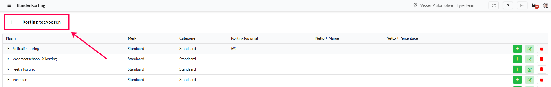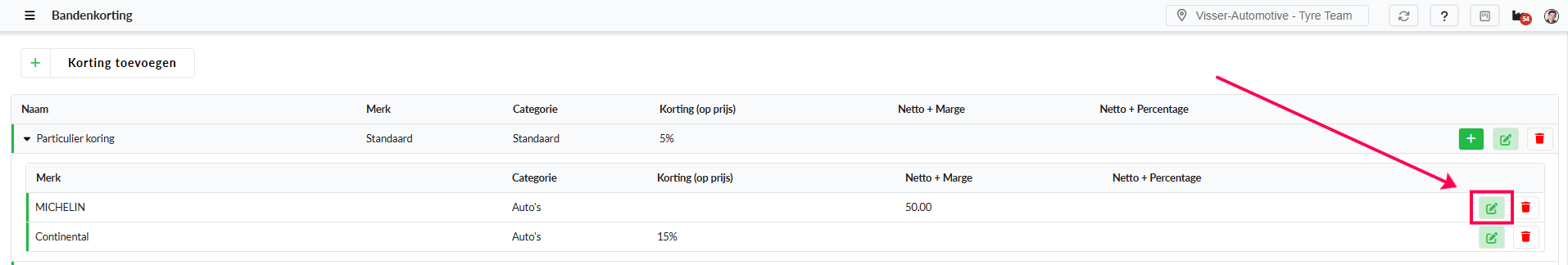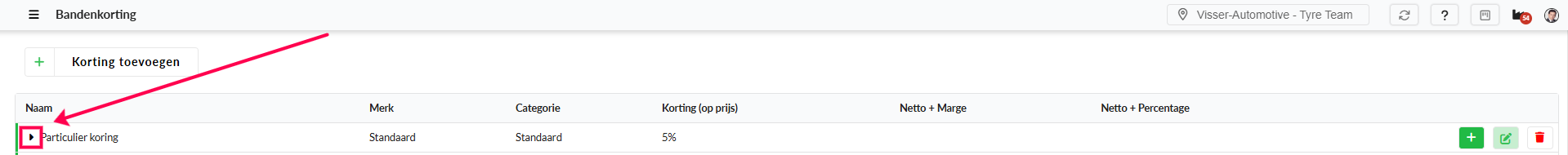 Nadat een merkkorting is aangemaakt kun je deze bewerken door aan de linkerkant op de korting, op het pijltje te klikken.