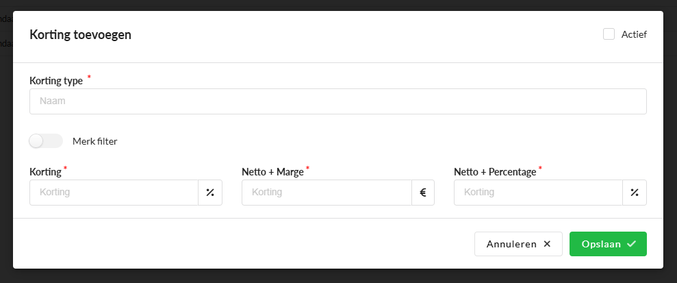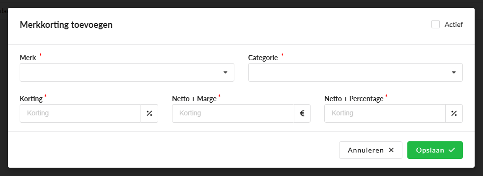 - Korting (%): Voer het percentage in dat van het brutobedrag wordt afgetrokken om de klantprijs te berekenen wanneer er geen merkgerelateerde subkorting is gedefinieerd.