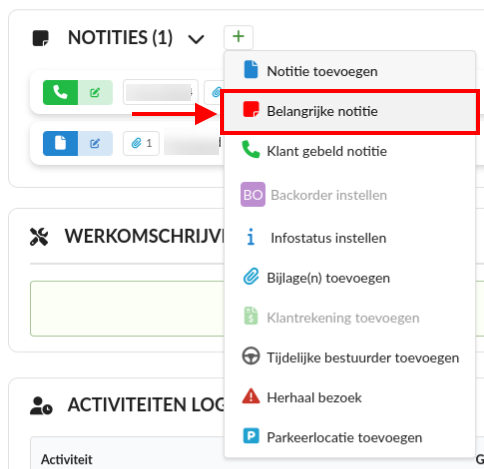 Let op: Per werkorder kun je maar één belangrijke notitie toevoegen.