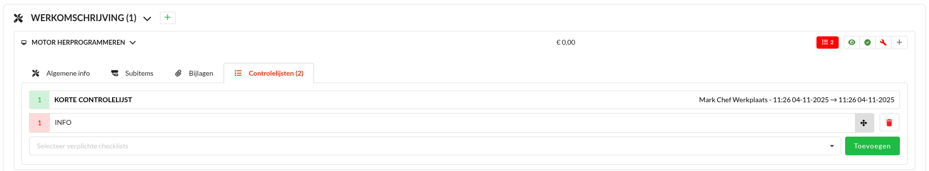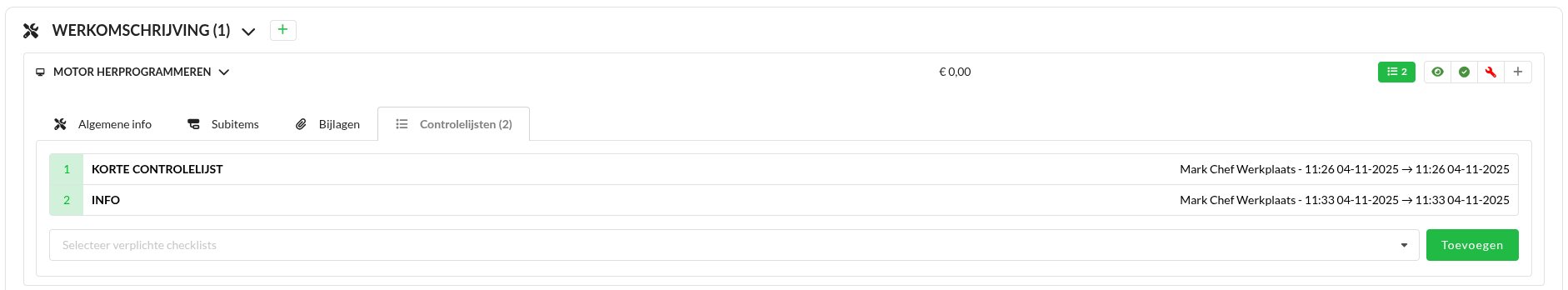 Nadat de monteur de controlelijst heeft afgewerkt, wordt deze in het groen weergegeven op de interventie in de werkorder.