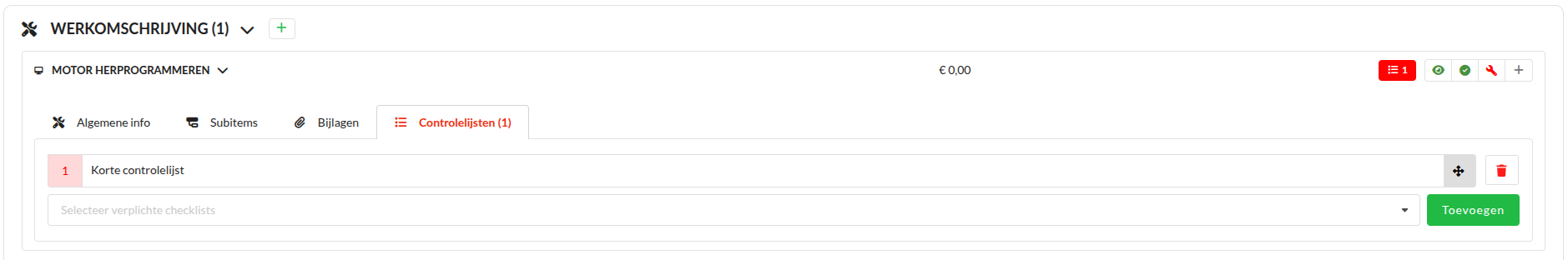 Met deze functie kan de receptionist één of meerdere verplichte controlelijsten aan een interventie toewijzen. De monteur weet dan welke controlelijst hij voor welke interventie moet uitvoeren. Dit kan bijvoorbeeld handig zijn bij garantieclaims. De werkorder kan pas worden voortgezet als die controlelijst is afgewerkt.